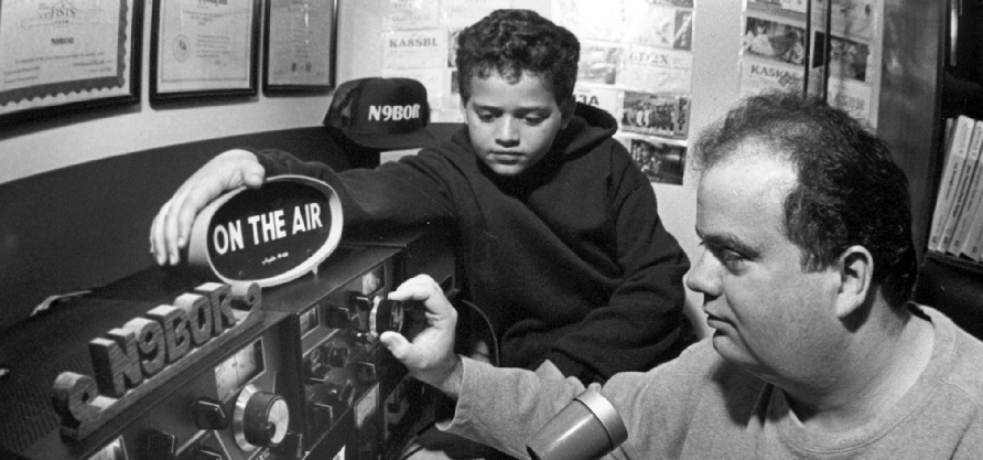 This photo was taken by a local newspaper for an article on ham radio. Although I rarely operate phone, the reporter wanted a microphone in the picture.My son, Steve, KB9YPC, looks on as I demonstrate my Drake Twins.